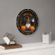 This charming Halloween and fall-themed clock features a gnome with an orange and black striped hat, sitting between two carved jack-o'-lanterns. A friendly ghost floats nearby, with bare trees and bats in the background under a dark sky. The clock has a black outer rim with orange numbers 1-12.
