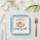 Die Herbstpapierplatte mit boho fallend weist einen Aquarellkürbis und ein Blattwerk mit kariertem, blauen Schnittmuster auf.
