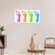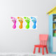 Eine Reihe von vier bunten menschlichen Fußabdrücken mit glücklichen Gesichtern.