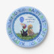 Herzlichen Glückwunsch zum Geburtstag, kleiner kleiner Junge in Aufhängern, der einen Ballon mit seinem Hund an seiner Seite hält, Geburtstagsparty-Teller. Blau und Grün.