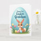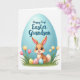 This greeting card shows a light brown bunny with big, gentle eyes and a small smile, sitting low in a tuft of spring-green grass with its fluffy white tail peeking out 🐰. Near its paws, three decorated eggs add a sweet, friendly touch, including one sunny yellow, one with pink dots, and one with tiny blue speckles. A large soft blue oval backdrop wraps the scene, giving it a calm, cozy setting that feels like a quiet moment shared with family. Across the upper area of the oval, the message “Happy First Easter Grandson” appears in flowing cursive-style lettering in a darker blue for easy contrast. On both sides of the bunny, small tulip bouquets lean inward as if they’re gathering close, with petals in gentle pinks and warm yellows 🌷. The lighting is even and soft, bringing out fine whiskers, rounded cheeks, and the tender way the bunny seems to look forward with affectionate curiosity. The edges of the blue oval fade slightly with a light gradient, while the grass blades and egg patterns stay crisp against the smooth background.
