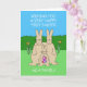 Ein Cartoon einer dreiköpfigen Kaninchenfamilie, bei der der Babyhase ein Ostereier hält. Das Bild wird von den Worten "Einen sehr glücklichen ersten Ostern als Familie wünschen" begleitet.
