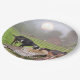 Diese Teller zeigen glückliche Ziegen, die bei Sonnenuntergang zu Abend essen.