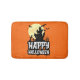 Gute Halloween Textil-Illustration mit Spuk Haus-, Friedhof- und Fledermausdekoration auf grunge-orangefarbenem Hintergrund.