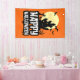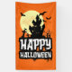 Gute Halloween Textil-Illustration mit Spuk Haus-, Friedhof- und Fledermausdekoration auf grunge-orangefarbenem Hintergrund.