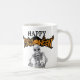 Cooles Halloween-Tasse-Geschenk mit einem beängstigenden Skelett, das vor gruseligen Orange- und Schwarztexten und einer phantastischen Kürbislaterne hängt.