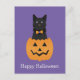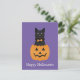 Niedliche Abbildung einer schwarzen Katze, die eine Bogen-Krawatte trägt, die aus einer Jack o' Laterne kommt.