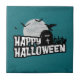 Fröhliche Halloween Textil-Illustration mit Friedhof- und Fledermausdekoration bei Vollmond auf grunblauem Hintergrund