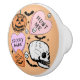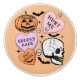 Farbenfrohe Halloween-Illustration mit Schädeln, Fledermäusen, Sternen, Kürbis und Bonbonherzen mit "Spooky babe", "Hunt me" und "Hot Ghoul" Textdesigns
