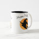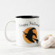 Design d'Halloween avec une sorcière méchante volant à travers une lune sur son balai, de Lesruba Designs Halloween Traitements.
