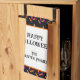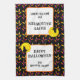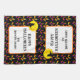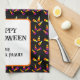 Ein niedliches, individuelles Halloween Küchentuch mit einer Hexe, die über einen Vollmond fliegt, auf einem farbenfrohen, gelben, orangefarbenen und lila Muster aus Süßmais mit grauem Briefe.
