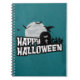 Fröhliche Halloween Textil-Illustration mit Friedhof- und Fledermausdekoration bei Vollmond auf grunblauem Hintergrund