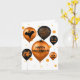Fröhliche Halloween-Illustration mit schwarz-orangefarbenen Party-Ballons mit Geist, Hexe, Spinne und Spinnennetz und Jack-o-Laterne auf weißem Hintergrund mit orangefarbenen Punkten.