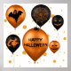 Fröhliche Halloween-Illustration mit schwarz-orangefarbenen Party-Ballons mit Geist, Hexe, Spinne und Spinnennetz und Jack-o-Laterne auf weißem Hintergrund.