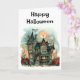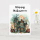 Glückliche Halloween-Grußkarte mit einem gruseligen Haus. Verwenden Sie den Link "Diese Vorlagendetails personalisieren", um den Gruß im Inneren zu ändern. AI unterstützte Grafik, die mit kommerziellem Einsatz erworben wurde. Kunstwerk: RedHeronLighthouse