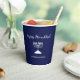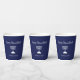 Happy Hanukkah Blue Holiday Papier Tasse, mit einer einfachen weißen Menorah und Schrift Typografie Design. Mit einer weißen, anpassbaren Schrift können Sie Ihre eigenen Informationen hinzufügen. Eine festliche Art, mit Freunden und Lieben zu feiern.