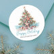 Weihnachtsbaum Classic Round Sticker am Strand. Mit diesem festlichen Rundaufkleber mit einem am Strand inspirierten Weihnachtsbaum aus Muscheln und Seestern verbringen Sie einen küstenartigen Beifall. Dieser Aufkleber eignet sich ideal für Urlaubswünsche am Strand und ist ideal für alle, die an tropischen Orten wie Hawaii wohnen, oder für diejenigen, die eine Küstenvibe Liebe haben. Das Design zeigt den Baum, der sich auf einem sandigen Boden mit sanften aquamarinen Ozeanwellen im Hintergrund konzentriert. Unter dem Baum ist "Happy Holidays" in elegantem Schriftzeichen verfasst und fügt eine festliche Touch hinzu. Der rustikale Aquarellstil und die Mischung aus einfacher Schrift und Schrift-Typografie verleihen ihm ein lässiges, aber poliertes Aussehen. Ideal für die Gestaltung von Weihnachtskarten-Umschlägen, Gastgeschenke oder jedes Urlaubsstil mit tropischer Drehung.