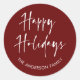 Happy Holidays Moderne Weihnachts Dunkelrot und Weiß Rundsticker mit Script Calligrafy und Familienname