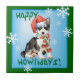 Feiern Sie die Urlaubssaison mit einem niedlichen sibirischen Husky-Welpe mit Weihnachtsmannmütze und Schal inmitten von Schneeflocken und den Worten, Happy Howlidays! Eine tolle Geschenkidee für Husky liebende Familien und Freunde.