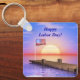 Ein Schlüsselanhänger mit meinem Bild von einem Dock auf dem Wasser mit der amerikanischen Flagge und Sonnenuntergang. Im Text steht "Glücklicher Arbeitstag!".