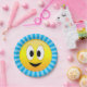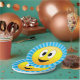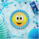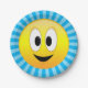 Machen Sie Ihr Party oder Picknick mit diesem fröhlichen Teller. Ein großes rundes, fröhliches gelbes Gesicht. Rund gelbes Gesicht mit großen ovalen Augen und einem leicht geöffneten, lächelnden Mund. Der Hintergrund ist ein blaues Sonnenburstmuster.