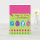 Designed with a lively split background, the top half is deep fuchsia while the bottom half is bright lime green, meeting in a crisp horizontal divide. A lime green arrow-shaped banner stretches across the middle, carrying a magenta message in flowing lettering placed neatly at its center. Four decorated egg shapes sit prominently in the middle, arranged like a small group sharing the spotlight with a friendly, togetherness feel 🐰. One egg is sky blue with tiny white blossoms and small fuchsia starbursts, while another is deep purple with thin golden curling lines that trail like gentle vines. A lighter blue egg features the white silhouette of a long-eared bunny with a small fuchsia bow, and beside it a pink egg shows tight concentric stripes in several colors, like rings wrapping around. Along the bottom edge, two rows of alternating fuchsia and lime green diamond shapes create a steady border that keeps the layout feeling organized yet festive 🌷. The overall look is brightly lit with smooth digital shading, and the banner sits just above the egg cluster while the diamond border runs straight across the base. The diamonds alternate fuchsia and lime green in a tidy pattern beneath the eggs.