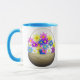 Eine Tasse für Mama mit meinem Design eines hübschen Korbs aus Blume und einem kleinen blauen Vogel. Der Text, der individuell angepasst werden kann, sagt "Glücklicher Muttertag".