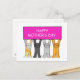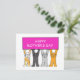 Vier Cartoon Kätzchen in verschiedenen Farben, stehend auf. Die Kätzchen halten ein heißrosa Banner über ihren Köpfen, das den "Tag der glücklichen Mutter" sagt. Das Bild ist ein Set auf weißem Hintergrund.