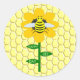 Dieses phantastische Aufkleberblatt zeigt ein grafisches Bild einer niedlichen gelben Hummel mit schwarzen Streifen, Augen, Antennen und Beinen. Es hat hübsche blaue und weiße Flügel. Die Biene sitzt inmitten einer goldgelben Sonnenblume. Die Blume hat einen grünen Stiel und drei Blätter. Die Meldung "Happy Bee Day" erscheint auf den drei Blätter verteilt. Der Hintergrund besteht aus einem gelben Wabenmuster.