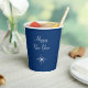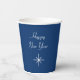 Happy New Year Blue-White-Paper Cup, mit einem Schneeflockendesign und individualisierbaren typografischen Schriftzeichen. Eine festliche Ergänzung zu Ihrem Party- oder Winterfest im Neujahr.