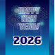 A vibrant New Year celebration scene unfolds with a dynamic bold text 'HAPPY NEW YEAR!' as colorful fireworks burst in the background. The fireworks illuminate the night sky with sparkling lights, creating a festive atmosphere. The year '2026' in large, playful font, surrounded by a gradient of blue hues. The lighting is bright and celebratory, enhancing the joyous mood of the scene.