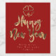 Happy New Year Typografie Elegant Rot und Gold, Imitate Gold Foil Text und 4 Leaf Clover on Festive Red Background, Moderne Drehbuch, Chic Neujahr Wein Label