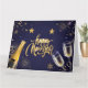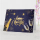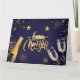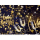 Eine festliche Neujahrsfeierszene mit einer Sektflasche und zwei mit Bläschen gefüllten Flöten. Der Hintergrund ist ein tiefblaues Marineblau mit goldenen Sternen, schimmernden Konfetti und runden Mustern.