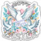 Frohe Ostern mit einem bunten fröhlichen Bild des Frühlings, mit Tauben und Blume.