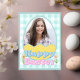 Diese individuell gestaltete Grußkarte bietet ein niedliches und farbenfrohes Ostermotiv. Ein Rahmen aus Ei wird in der Mitte platziert, mit einem Beispiel-Foto, das Sie personalisieren können, um Ihr eigenes Foto oder Bild einzubinden. Ein "Happy Oaster" Gruß wird unten in einem blau-rosa Schriftart gedruckt. Kleine Frühlingsblumen sind auf beiden Seiten des Gruß platziert. Der Hintergrund ist ein pastellfarbenes aquamarines kariertes Muster.