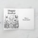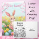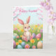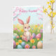 Personalisierter Cartoon Osterhasen Osterkarte mit einer Innenfarbenseite. Niedlicher Hase im Gras mit rosa und blauen Blumen und Ostereiern.