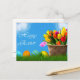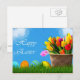 Osterfarben, sonniger Himmel, blühende Tulpen, "Happy Oaster", Postkarte.