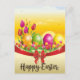 Schöne Frühlingsszene mit bunten Tulpen und bunten Ostereiern mit rotem Band. Frohe Ostern!