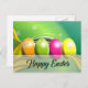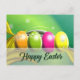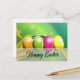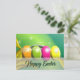 Farbenfrohe Ostereier und ein herrlicher Tau-Hintergrund am Frühling mit frischen Blätter und kleinen Tropfen. Frohe Ostern!