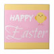 Ein niedliches, kleines, gelbes Küken auf rosa Untergrund, mit dem Gruß "Happy Oaster" und einem gelben Rahmen.