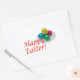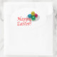 Happy Ostertext in roter Farbe und eine weiße Porzellanplatte mit vier bemalten Eiern in den Farben blau, grün, rot und gelb. Drucke und Geschenke für alle