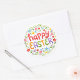 Happy Ostertext mit farbenfrohen Blume und grünen Blätter, die einen Kreis auf einem farbenprächtigen Hintergrund bilden, Sommerurlaub Thema, lebhafte Farben, fröhliches Design.
