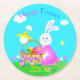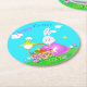 Ein niedlicher rosa Hase, der einen Osterkorb mit farbenfrohen Ostereiern, ein gerade geschlüpftes Küken und eine Nachricht von "Happy Oaster" trägt.