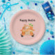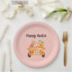 Schwarzer Happy Ostertext mit einem sonnigen Fahrer mit riesigen Karotten auf rosa Hintergrund.