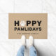 Ein festliches und lustiges Urlaubsdomizil für Liebhaber von Haustieren mit modernem Hundeschema "Happy Pawlidays". Personalisieren Sie den benutzerdefinierten Text mit dem Familiennamen. Niedliche Pfotendrucke prägen den handgeschriebenen Stil. Enthält einen rustikalen, neutralen und texturierten Hintergrund.