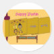 Stickers mit einem Design für Purim, das einen Megilla, Gräber (Lärmpegel) und Bilder von Mordekhai, Esther, Ahaschverosh, Haman und Hamantaschen (Gebäck aus Haman's Hut) umfasst