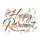 Aquarellmalerei der Worte "Happy Retirement" in einem farbenfrohen, festlichen Stil, mit Konfetti und Streamern verstreut über den Text. Die Buchstaben werden mit einem Farbverlauf gemalt, der von Rot über Orange bis Gelb, Grün, Blau bis lila übergeht. Die Konfetti und Bänder sind in verschiedenen Farben gestrichen, was das feierliche Ambiente des Bildes noch verstärkt. Der Hintergrund ist weiß.