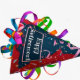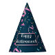 Ein buntes Party mit Konfetti und Bändern. Der Hut betont das lebendige Design und die fröhliche Botschaft von "Happy Retirement".