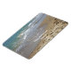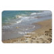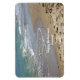Foto am Rand eines Sandstrandes, mit ruhigen Wellen, die in Meeresschaum brechen.