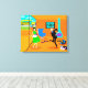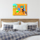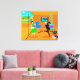 Cette Happy Retro Parents Stretched Canvas Print montre une maman et papa se réjouissant quand leur enfant fait un tiret pour le bus scolaire. Le duo de célébration est dans leur style années 60, moderne du milieu du siècle, salon. La décoration orange est tout sauf sobre. Cheminée à cône turquoise, chaise d'oeuf bleu vif contre mur en pierre orange. Sur le mur, vous trouverez l'impression en toile Stretched Art Moderne du milieu du siècle, disponible au magasin Zazzle de StrangeLittleOnion. Au sol, il y a un lecteur portable bleu et noir avec plusieurs albums de vinyle éparpillés à proximité. Papa, porte un costume noir avec une chemise bleu clair et une cravate bleu foncé. Il dévoile tous ses meilleurs mouvements de danse, le genre de ceux qui amèneraient des rouleaux oculaires de juniors. Maman porte une robe verte et vibrante et un tablier blanc et vif avec garniture bleue. Elle est debout devant des portes coulissantes en verre en agitant joyeusement tandis que son enfant court sur le trottoir avant vers le bus scolaire jaune qui attend. A travers les portes, on peut voir leur pelouse de banlieue parfaitement entretenue et leur proverbiale clôture blanche pour piquetage. Même l'arrière - plan est satisfait d'un ciel turquoise et des silhouettes de cèdres. Tu sais ce qu'ils disent... Quand l'enfant est parti, les parents vont jouer !